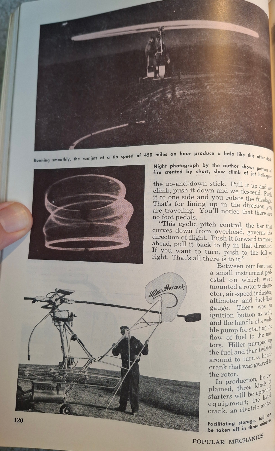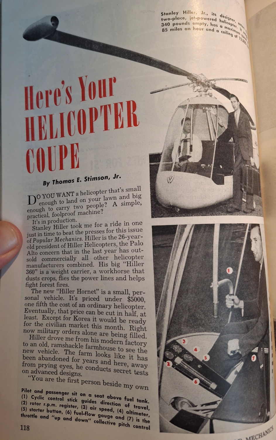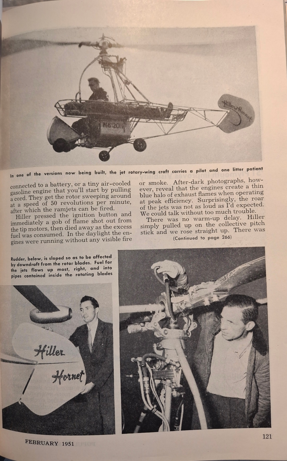 Časopis Popular Mechanics z roku 1951 ho označil za „osobní vrtulníkové kupé, které můžete zaparkovat v garáži“. Rotor poháněly miniaturní proudové motory umístěné na koncích listů, díky nimž měl být „lehký, tichý a snadno ovladatelný“. Hiller věřil, že „vrtulník se stane dopravním prostředkem každého člověka“ a že „v budoucnu bude stejně běžný jako automobil“.
